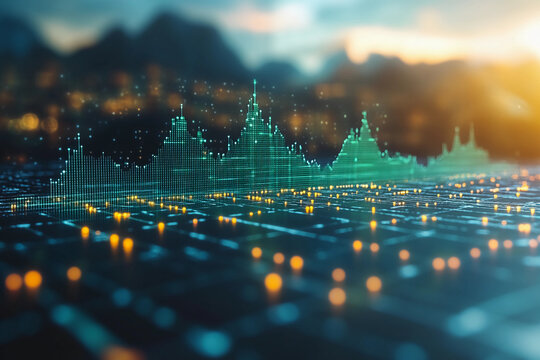 Illuminated 3d bar chart and waveform data visualizations evoke financial growth and technological advancement in a futuristic digital realm