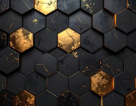 Abstract geometric pattern of hexagonal tiles in dark tones with gold accents