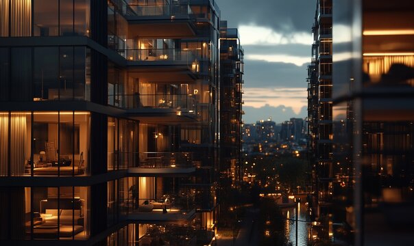 Urban skyscrapers in a city alleyway, illuminated windows reflecting light