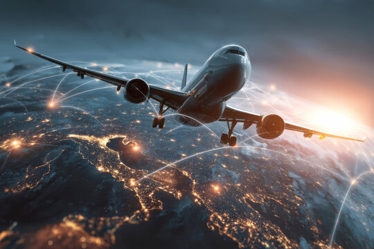 Cargo plane navigating global trade routes with illuminated cities and interwoven connections