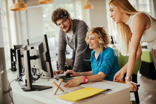 A diverse team of professionals engaged in a collaborative workspace, discussing ideas and strategies while utilizing modern technology in an inspiring office environment.