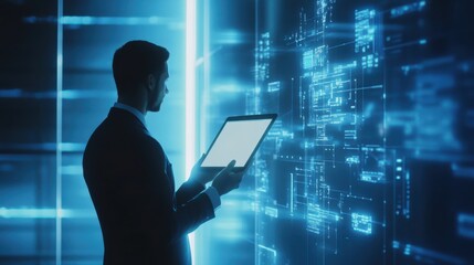 Construction manager analyzing data with digital interface in warehouse, focusing on technology, safety protocols, and project management in industrial setting.