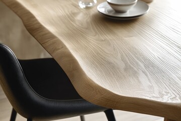 A modern dining room featuring wooden table and chairs, complemented by large window showcasing serene outdoor view. space exudes tranquility and warmth