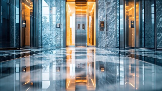 Modern building lobby with marble floors and glass elevators reflecting light.