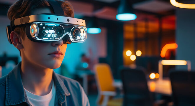 Augmented Vision in Action: Person Wearing AR Glasses in Modern Workspace