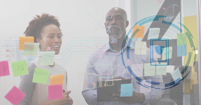 Arranging woman reviewing colorful sticky notes on whiteboard in office with padlock grid overlay
