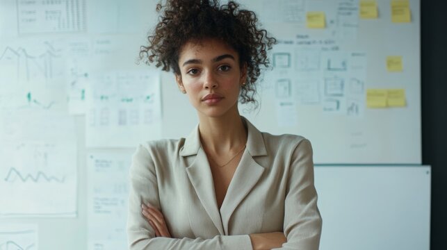 Confident businesswoman stands with arms crossed in a modern office surrounded by project plans and strategic graphs