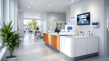 Detailed architectural sketch of a modern high tech dental clinic featuring a clean minimalist black and white aesthetic with abstract technology inspired elements and a sophisticated