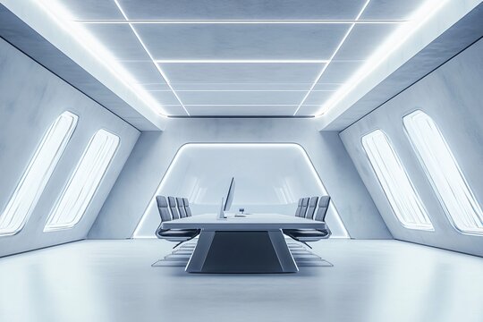 Modern office corporate interior for meeting area, futuristic conference room, high tech style boardroom for brainstorming, business concept, no people