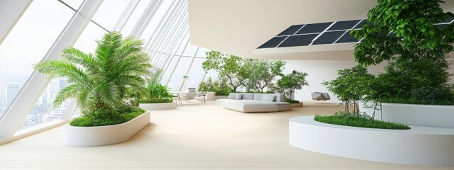 Futuristic office design feature solar energy and green rooftop gardens Generative AI