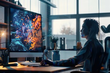 A modern office interior featuring desks, computers, and potted plants, with large windows allowing natural light. Concept Modern Office Design, Functional Workspaces, Natural Light Integration