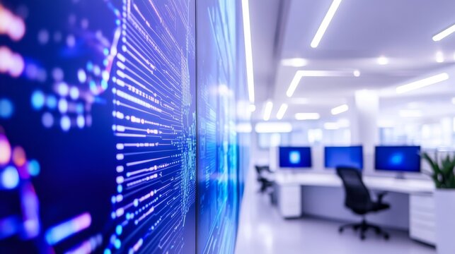 A business professional stands in front of a large digital display, deeply focused on analyzing data trends. The sleek office setting features contemporary design elements and vivid visuals