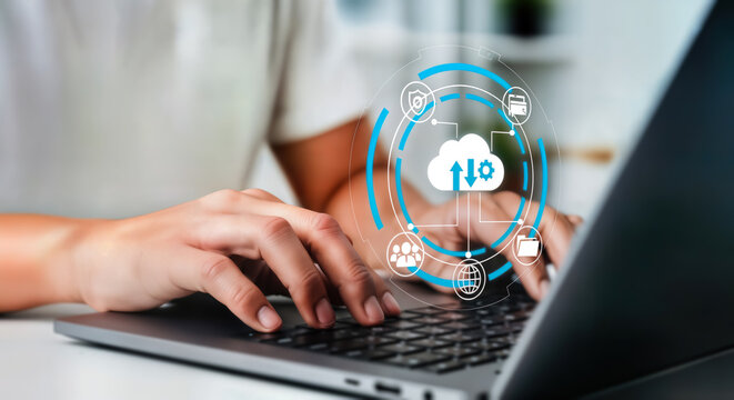 Person typing on a laptop with a glowing cloud computing icon and network connections overlayed, symbolizing digital data transfer and online services