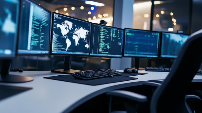 A detailed cybersecurity operations center, modern office with multiple monitors, Secure style