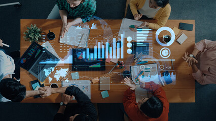 Aerial view of diverse professionals engaged in data analysis and strategic planning, surrounded by laptops and digital charts, showcasing collaboration in a modern office. Scalp