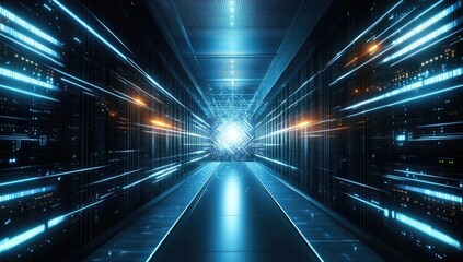 A modern data center with rows of server racks illuminated by blue light, representing advanced technology and computing infrastructure.