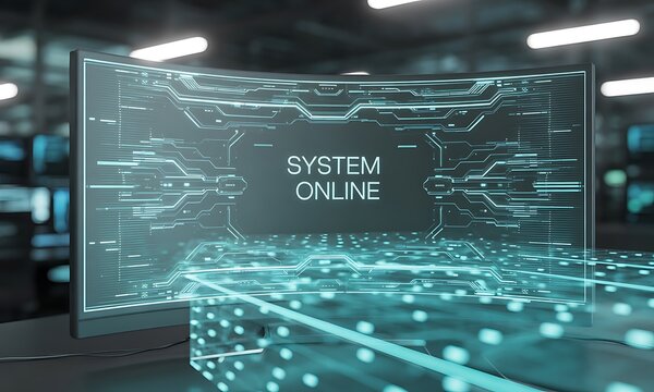 Curved monitor displays "System Online," showcasing futuristic digital circuitry and data flow.