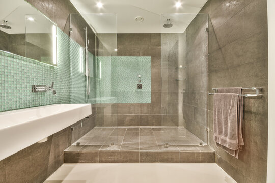 Contemporary, bright bathroom with wooden furniture, stone tiles and glass shower cabin. Design concept.