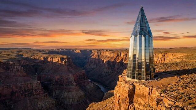 Glass skyscraper building rising from the sandstone cliff of the grand canyon, showcasing a striking blend of modern architecture and natural landscape under a vibrant sunset sky