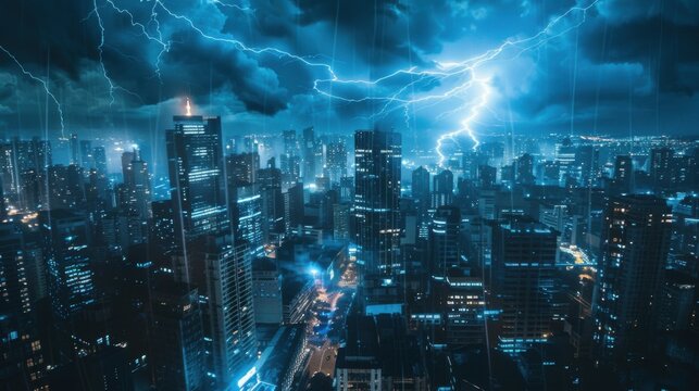 Dramatic lightning over night city skyline with illuminated skyscrapers