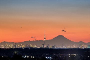 Tokyo night view , Tokyo Skytree landmark with Tokyo downtown building area and Mountain Fuji in winter season