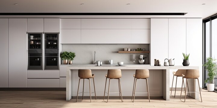 Modern two-storey kitchen with white walls, wood flooring, built-in cooker, and gray island with sink and stools - visualization