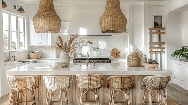 A coastal interior design concept dining natural material cosy comfort Woven pendant lights bring a modern coastal feeling to this light and airy kitchen The stylish counter stools. Generative AI.