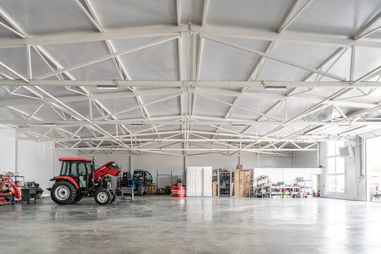 Agricultural machinery and storage area in modern industrial warehouse with tractor, shelving, cardboard boxes and tools. Farming, logistics, facility and transportation niches.