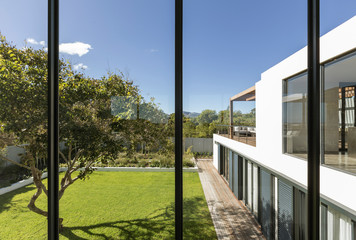 View from windows of sunny modern luxury home showcase exterior with yard and tree