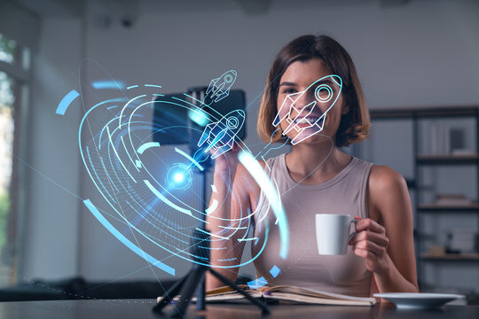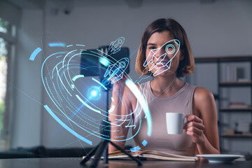 Woman interacting with digital rocket launch interface holding coffee in modern office background, representing startup innovation concept.