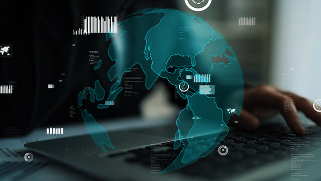 A close-up image showing hands typing on a laptop with a digital globe overlay, emphasizing data visualization and modern technology in a professional environment. Xenic