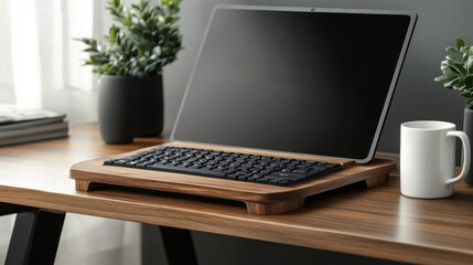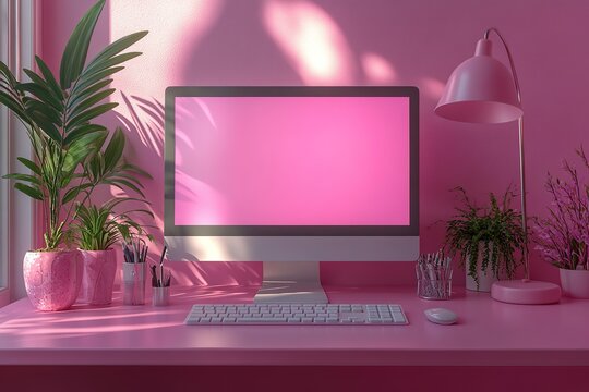 Modern Desktop Setup with Blank Screen and Green Plants on Table