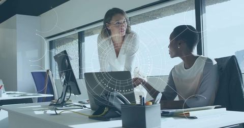 Female coworkers collaborating at modern office desk with laptop and hud overlay
