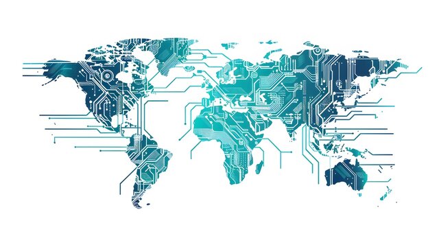 Illustration of a world map with artificial intelligence design on white background. Generative AI