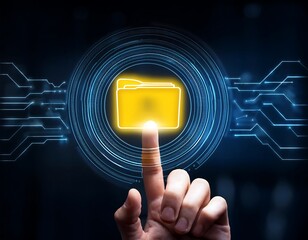 A finger taps a glowing yellow folder icon on a futuristic background, symbolizing access to digital information and resources.