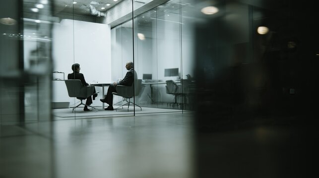 Businessmen walking through bright modern office hallway with glass walls and green plants.