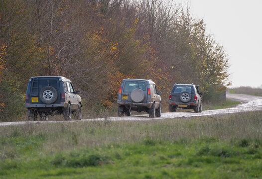 three modified off road 4x4 vehicles driving along a mud track, Wilts UK