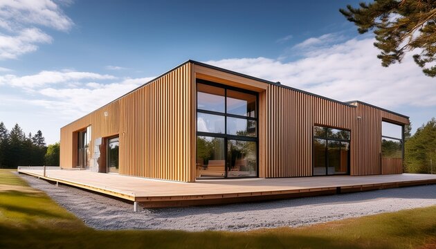 Newly built single storey prefabricated modular building. Prefabricated mobile wooden house at construction site