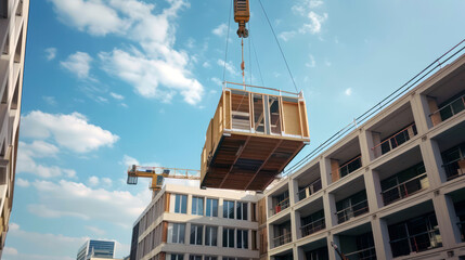 A modular building section being lifted by a crane under a bright sky, showcasing the construction of a modern architectural project in progress.