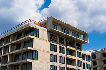 Modern modular private townhouses row. Residential minimalist architecture exterior. Town homes complex with cubic facades, cladding, panoramic balconies. Suburban neighborhood with family bungalows,