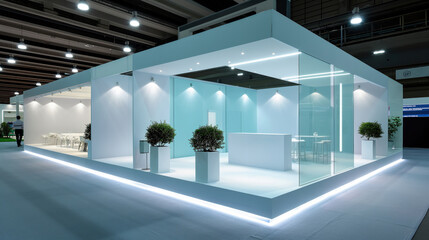 A beautiful exhibition stand in the form of a room with an interior in beige and light colors for presentation. Lighting, white ceiling, modular texture of materials, modern furniture. Creative design
