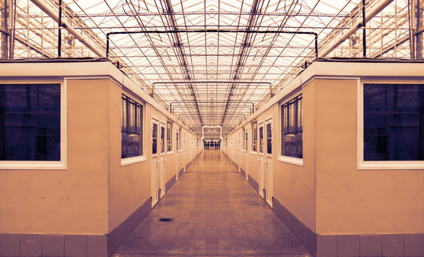 Modern interior architecture of metal steel roof structure of airport or industrial factory.