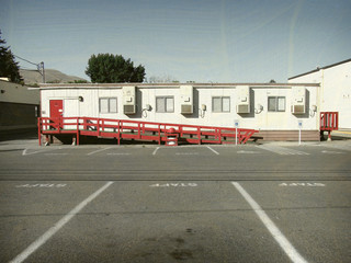 aged and worn vintage american modular school building