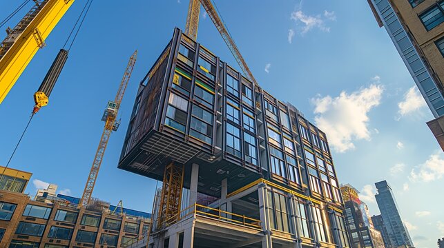 High-rise modular building under construction with cranes. Concept of urban development, innovation, and architecture.