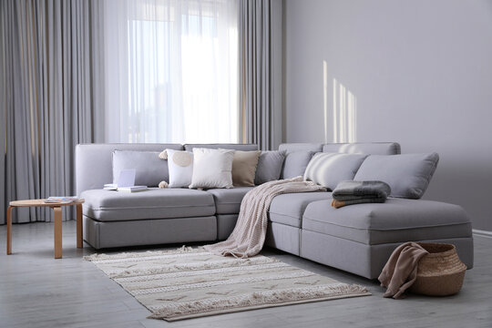 Living room interior with large grey sofa
