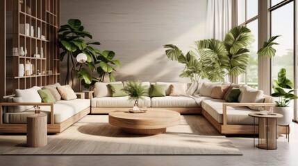 Modern interior of open space with design modular sofa, furniture, wooden coffee tables, plaid, pillows, tropical plants and elegant personal accessories in stylish home decor. Neutral living room.