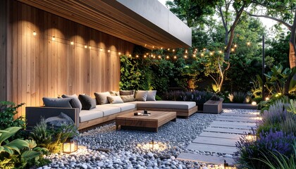 Sleek outdoor patio with vertical garden walls, modular wooden seating, pebble mosaic floor, ambient string lights, realistic HD captured clarity.