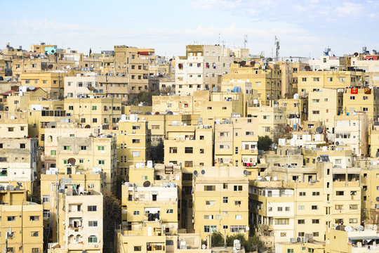Close-up view of some residential buildings seen from the Amman Citadel in Jordan. The Amman Citadel is a historical site in Amman, Jordan.