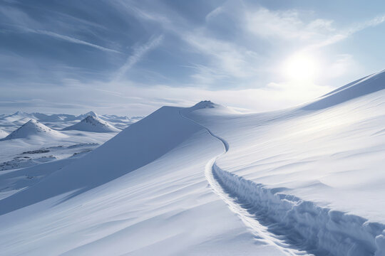 Line Of Ski Tracks Descending Snowy Mountain, Showcasing Linear Perspective. Generative AI