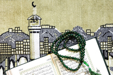 Mohammedan prayer carpet with holy book Koran